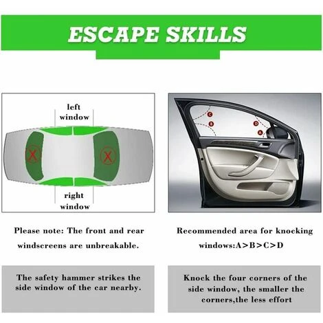 Finestra demolitore e tagliacinture di sicurezza 2 in 1. Il taglia cinture di sicurezza viene utilizzato per tagliare la cintura di sicurezza dell’auto per liberare i passeggeri intrappolati nel sedile. L’interruttore del finestrino viene utilizzato per rompere il finestrino sinistro o destro per aiutarti a scappare dall’auto. Durevole, di qualità.