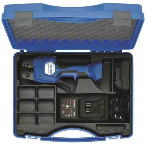 • Concetto di controllo semplice e sicuro: Concetto di controllo del pulsante per il controllo di tutte le funzioni dell’utensile • Controllo elettronico con funzione di blocco Monitorata Completa chiusura degli inserti • Facile e sicuro: Ritorno automatico dopo il funzionamento completato • Ritorno manuale come richiesto • Protezione del blocco motore • Alloggio ergonomico 2k in Design della linea della vasca • Occhielli di montaggio per l’uso con bilanciatore o come fusibile in uso esterno • Peso molto basso e alta velocità per la massima efficienza • Potente tecnologia di trasmissione per lavoro senza affaticamento • Potente batteria agli ioni di litio da 10,8 V – con indicatore di stato di carica • LED per l’illuminazione dello spazio di lavoro • Display di manutenzione mediante LED • Registrazione relativa al progetto con pacchetto software KLauke I-Press® • Inserti stampa intercambiabili della serie 50