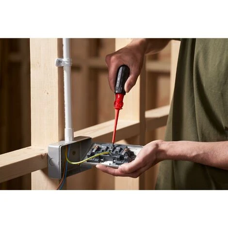 Il giravite isolato con lame intercambiabili ha punte sabbiate nere per miglior capacità di serraggio e resistenza alla corrosione.Isolamento elettrico 1000V Si.