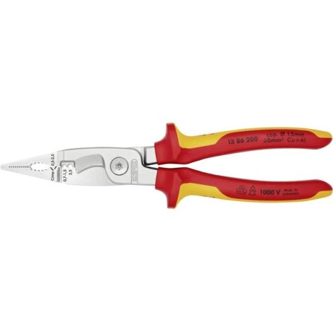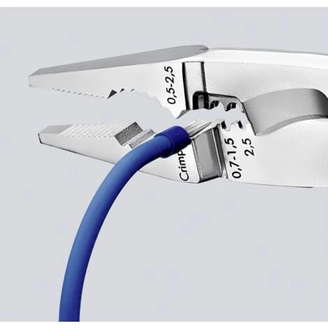 Pinza multifunzione per elettroinstallatori- per la presa su materiali di forma piana e arrotondata, per piegare, togliere le bave, tagliare cavi, spelare e crimpare terminali a bussola 6 funzioni in un’unica pinza Superfici lisce sulla punta per una presa sicura e delicata di fili singoli- superfici di contatto profilate e foro ellittico dentato per afferrare materiali di forma piana e arrotondata Bordo esterno dei becchi più affilato per lavorare su frutti a incasso e togliere le bave di fori passacavi Fori spelacavi per conduttori 0,7 – 1,5 mm² e 2,5 mm² Incavo di crimpaggio per terminali a bussola 0,5 – 2,5 mm² Cesoia con taglienti di precisione (temperati ad induzione) per cavi in rame e in alluminio fino a 5 x 2,5 mm² / Ø 15 mm Presa senza apertura della pinza (meccanismo di ritenuta intelligente nella versione con molla di apertura). La pinza rimane chiusa e protetta Forma affusolata per un’ottima accessibilità al pezzo in lavorazione Articolazione a vite: alta precisione e movimento ottimale