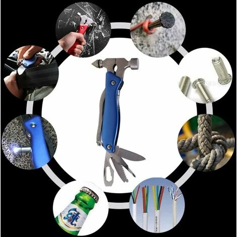Strumento multifunzione 15 in 1 contenente una sega, un cacciavite Phillips, un cacciavite dritto, un martello piatto, un apribottiglie, un gancio, un martello conico , un coltello, una chiave inglese, un tagliafili, pinze, pinze a becchi piatti, lime