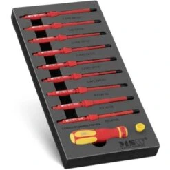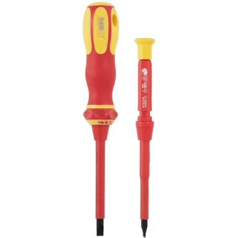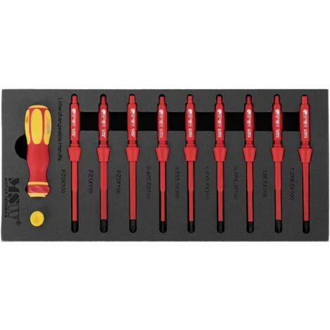 Il set di cacciaviti è composto da in un manico gommato, che si adatta perfettamente alla mano e trasmette la forza applicata in modo ideale. Il cacciavite si inserisce semplicemente nel gambo. Se la punta è troppo grande o troppo piccola, può essere facilmente sostituita. È possibile scegliere tra sei cacciaviti a taglio da 0,4 x 25 mm a 1,2 x 6,5 mm e tre cacciaviti a croce nelle misure da PZ1 a PZ3. Questi cacciaviti da elettricista professionali si distinguono per la loro fattura in acciaio legato con una durezza di 56-58 HRC.