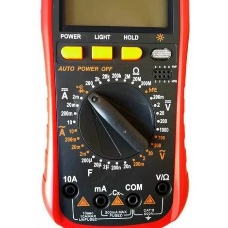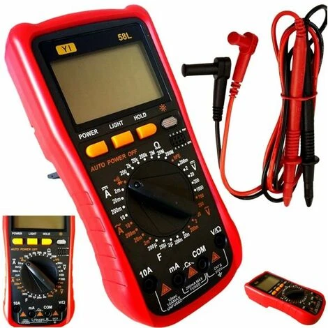 Ottimo tester multimeter digitale multifunzione. Professionale e completo di puntali per la misurazione. Spegnimento automatico Caratteristiche tecniche: DC Tensione:Passi: 200mV, 2V, 20V, 200V, 1000VRisoluzione: 0.1 mV, 1 mV, 10 mV, 100 mV, 1 VPrecisione: 0,5% + 0,8% + 1cifra a 2 cifre Tensione AC:Passi: 220mV, 2V, 20V, 200V, 700VRisoluzione: 0.1 mV, 1 mV, 10 mV, 100 mV, 1 VPrecisione: 0,8% + 3 cifre, 1,2% + 3 cifre DC e AC amperaggio:Passi: 2mA, 20 mA, 200 mA, 10 ARisoluzione: 1uA, 10 uA, 100 uA, 10mAPrecisione: 1% + 1 cifra, 2% + 5 cifre Resistenza:Velocità: 200, 2k, 20k, 200k, 2MOhm, 20MOhm, 200MOhmRisoluzione: 0.1, 1, 10, 100, 1k Ohm, 10k, 100 kOhmPrecisione: 0,8% + 2 cifre, 1,5% + 2 cifre Capacità:Passi: 20nF, 200nf, 2uF, 20uF, 200uFRisoluzione: 10pF, 100pF, 1nF, 10uF, 100uFPrecisione: 2.5% + 5 cifre Specifiche tecniche:Campo di temperatura ottimale: 0-40 ° CPeso: circa 300g (batteria inclusa) Il grado di accuratezza:DC Tensione 200mV-1000V (0,5% + 5)AC Tensione 200mV-750V (+ 0,8% + 5)DC-20A Corrente 20mA (1% + 5)AC-20A di corrente 20mA (1,2% + 10)Resistenza 200-200M (+- 0,8% +1)Capacità 2nF-200 uF (+-5% + 35)