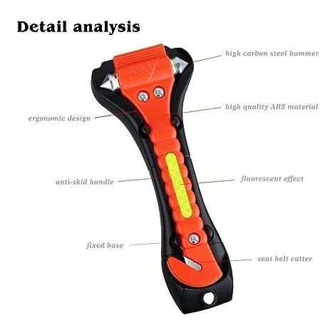 Tagliavetro e taglia cinture di sicurezza 2 in 1. Il taglia cinture di sicurezza viene utilizzato per tagliare la cintura di sicurezza dell’auto per liberare i passeggeri bloccati nel sedile. L’interruttore del finestrino viene utilizzato per rompere il finestrino sinistro o destro per aiutarti a scappare dall’auto. durevole, di qualità.