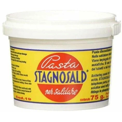 PASTA DISSALDANTE STAGNOSALD CONFEZIONE GR.75 Pasta disossidante che facilita la saldatura, rende scorrevole lo stagno nelle saldature dolci, rame, viene utilizzato come sostituto degli acidi corrosivi Viene impiegato in tutti i lavori di elettricità , radio, TV, telefonia, minuterie metalliche Si usa con lampada a gas quale decapante per le saldature capillari dei tubetti e dei raccordi di rame negli impianti idraulici e riscaldamento