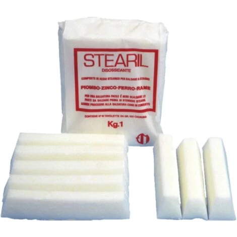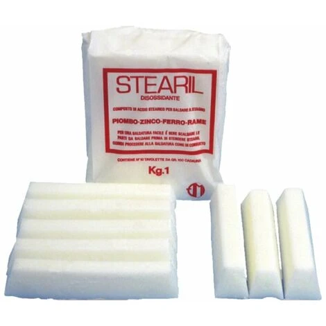 stearina speciale per saldare a stagno congiunzioni di tubazioni in piombo con piombo, ottone, rame, ferro, zinco negli impianti idraulici. Confezione da 1 kg