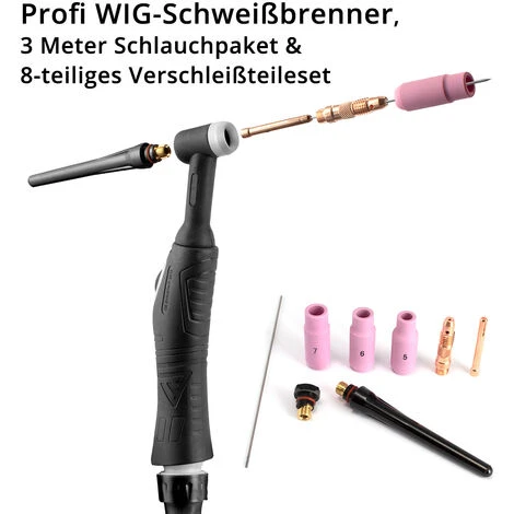 - Torcia professionale per saldatura TIG WP-26F / pacchetto di tubi flessibili da 3 metri* con testa della torcia flessibile e protezione antipiega sul raccordo del gas