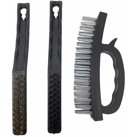 Set 3 spazzole con fili in ferro Ideale per pulire ruggine, calcare, sverniciare e lavorare superfici in metallo Dotato di comoda impugnatura ergonomica in plastica Dimensioni spazzole: 2 da 225m – 1 da 170mm