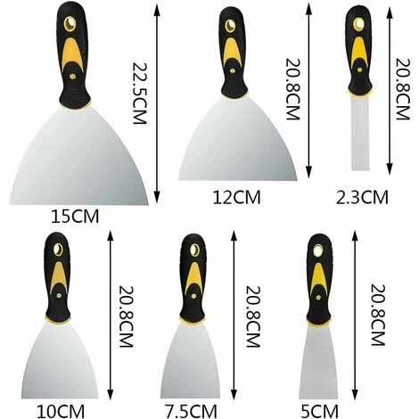 Dimensioni: lo strumento raschietto ha 6 diverse dimensioni: 23 mm, 50 mm, 75 mm, 100 mm, 120 mm, 150 mm. (1, 2, 3, 4, 5, 6 pollici) La varietà di dimensioni del set di spatole soddisfa le diverse esigenze di riparazione del muro a secco domestico e altro ancora.