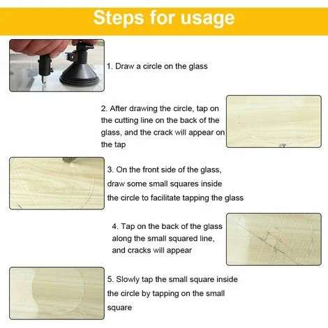 Tagliavetro circolare regolabile, pulsante tondo, ventosa che tiene il centro mentre la ruota taglia.