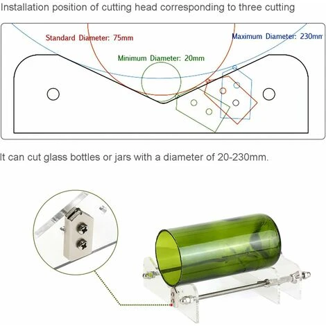 Si adatta alla maggior parte delle bottiglie: questa tagliabottiglie di vetro è adatta per la maggior parte delle bottiglie di diverse dimensioni e forme, a meno che la bottiglia non sia in rilievo.La parte migliore di questo tagliabottiglie è che può cambiare la posizione della lama, quindi puoi persino tagliare il parte centrale più sottile della bottiglia.Si applica alla bottiglia rotonda, alla superficie di piccole dimensioni e alle dimensioni grandi della bottiglia quadrata, ecc.